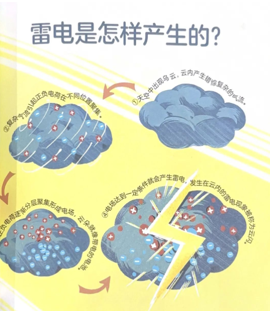书里把雷电的形成讲得很清楚,还用图画演示了一遍:
